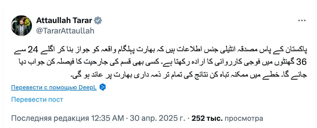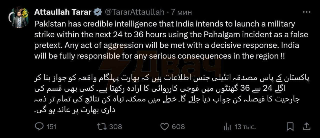 1️⃣ Pakistan's Information Minister says India intends to attack the country within 24-36 hours.