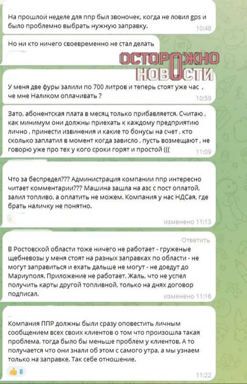 "In the Rostov region nothing works either, I have loaded crushed stone trucks standing at different gas stations around the region," complains one of the carriers. "Advanced Payment Solutions" is an independent fuel card operator whose services are used by companies in the Russian Federation and other countries.