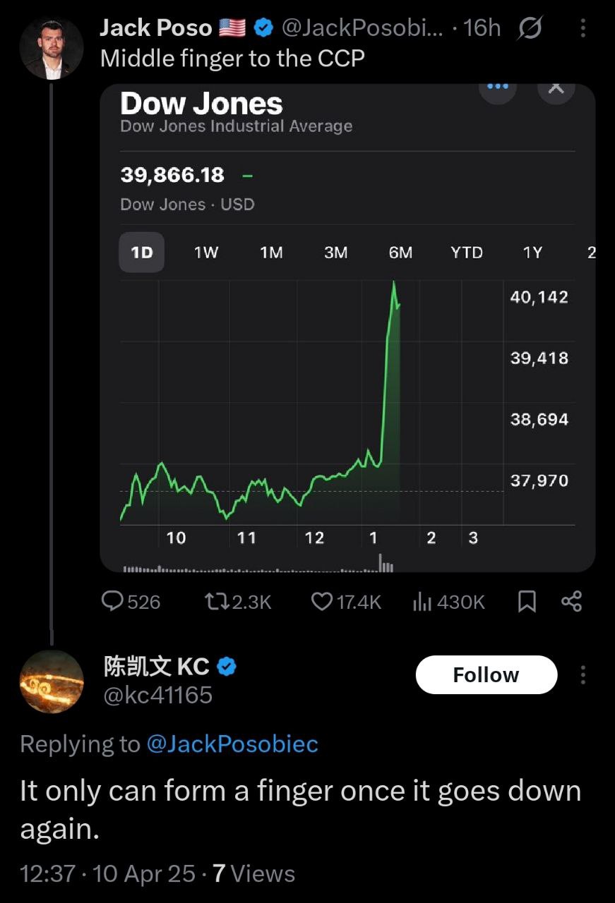 In social networks it was noted that Trump was scaring China with 100% tariffs for invading Taiwan, and now the tariffs are already 104%. Accordingly, China now has a good way to get a discount)