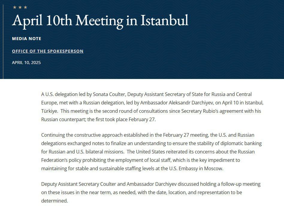 Lunch at the talks between the Russian and US delegations in Istanbul is over, the second part of consultations begins.