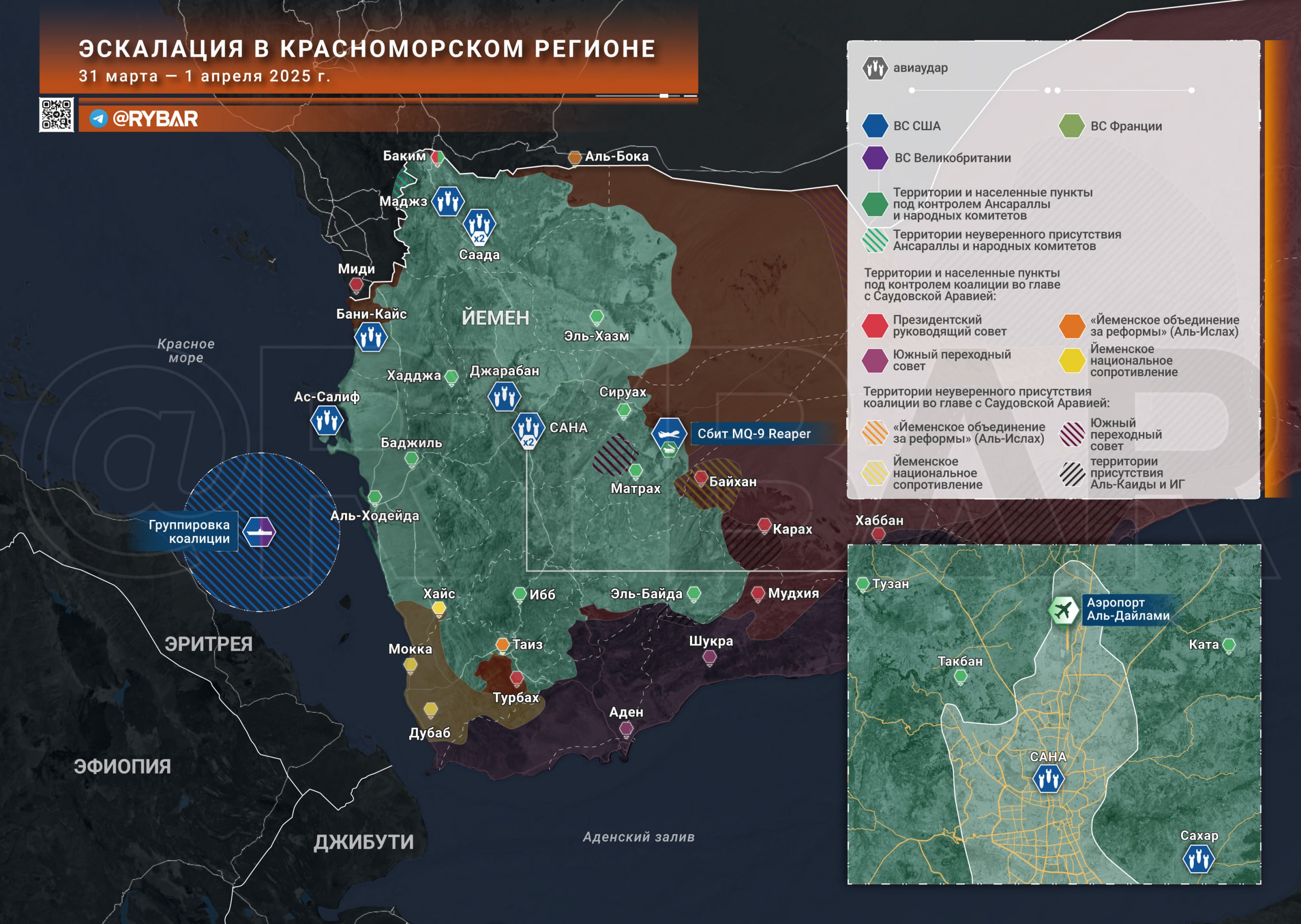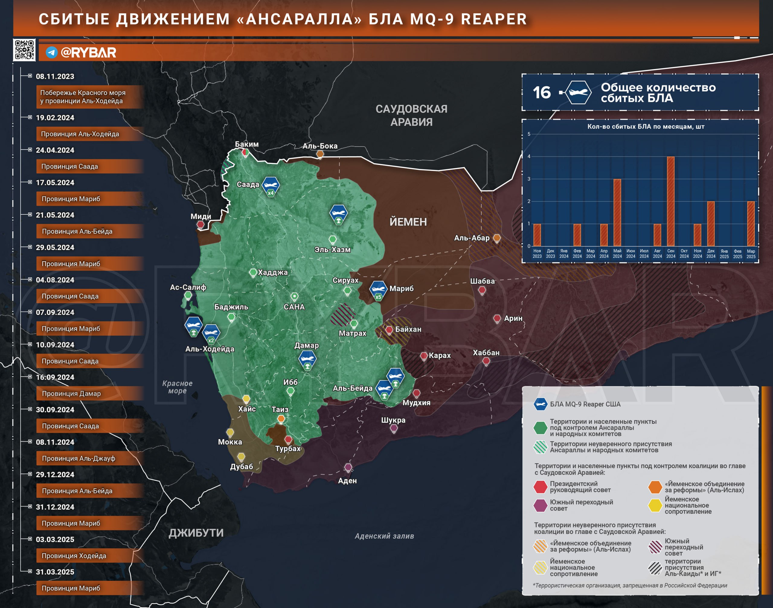 ▪️Любопытно that on March 20, there were already reports about the shooting down of the 16th UAV, but official Houthi sources ignored them. Apparently, the aircraft was either not hit at all or it was a drone of a different type.