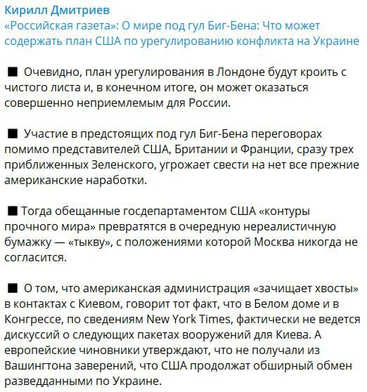 Kirill Dmitriev warns that in London, representatives of Europe and Ukraine will present a new peace settlement plan that will leave no American developments that Russia could take as a basis for negotiations. In such a case, Russia will have nothing left but to refuse to participate in such a settlement and, despite the rejection of favorable contracts with the United States, to continue the ground operation in Ukraine until all its goals are achieved.