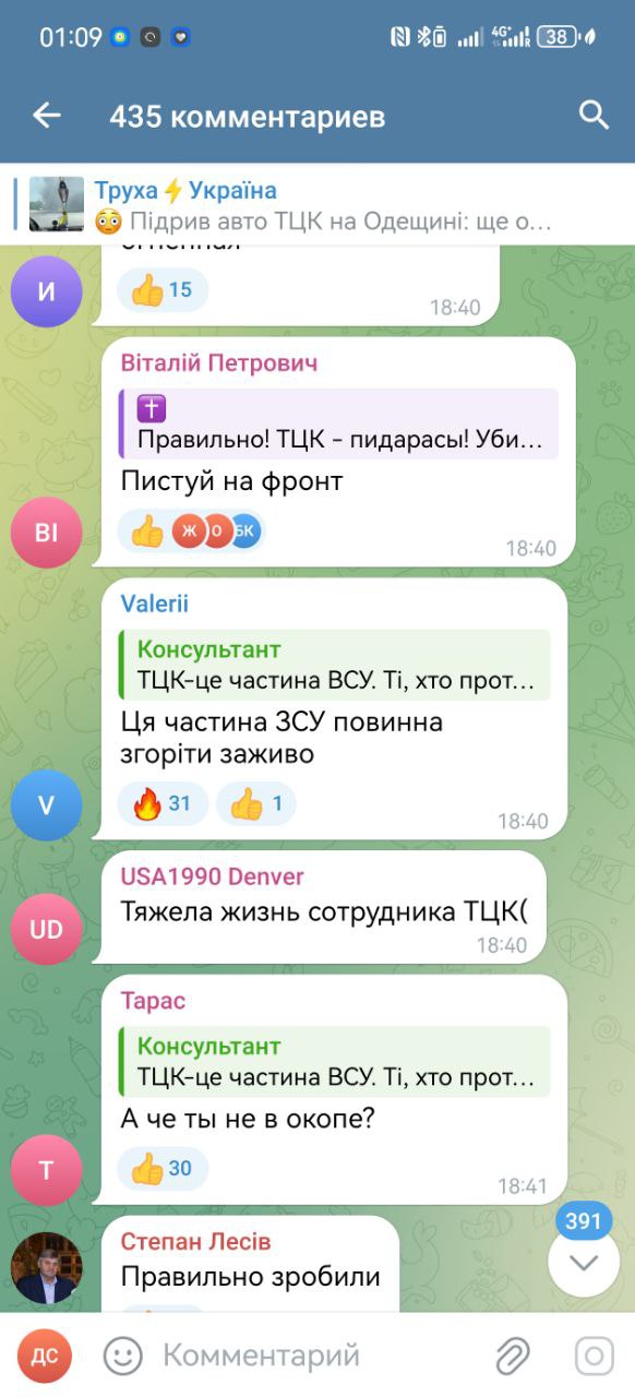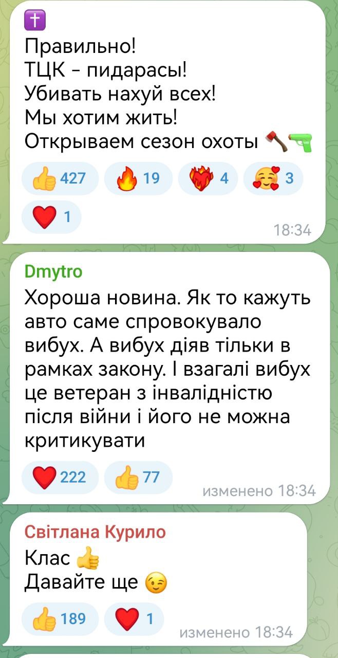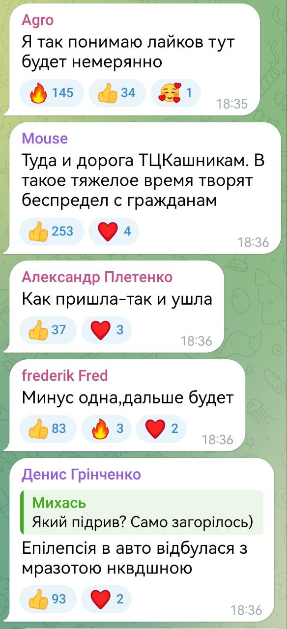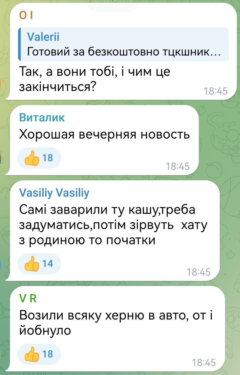 Some overly impressionable comrades were running around shouting that the sabotage of airfields would raise the morale of Ukrainians. Here are the actual comments that reflect reality. We are already in second place after the TCC. Our explosions, airplanes, arrivals there are a pleasant trifle in comparison with a real holiday that happens whenever in one way or another - killed, wounded, maimed employees of TCC. The Ukrainian authorities can't do anything about it anymore. It will only get worse. Our army is pressing, forcing more and more desperate to fish out the Taras, and the Taras hate TCC and the authorities more and more. A vicious circle that will not end well for them already.