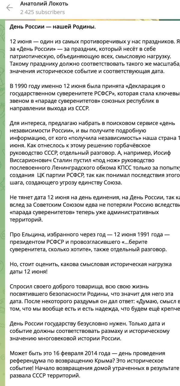 The date of June 12 is not a day of unity, the Day of Russia, because after the Soviet Union almost lost Russia due to the "parade of sovereignty" of now administrative territories.