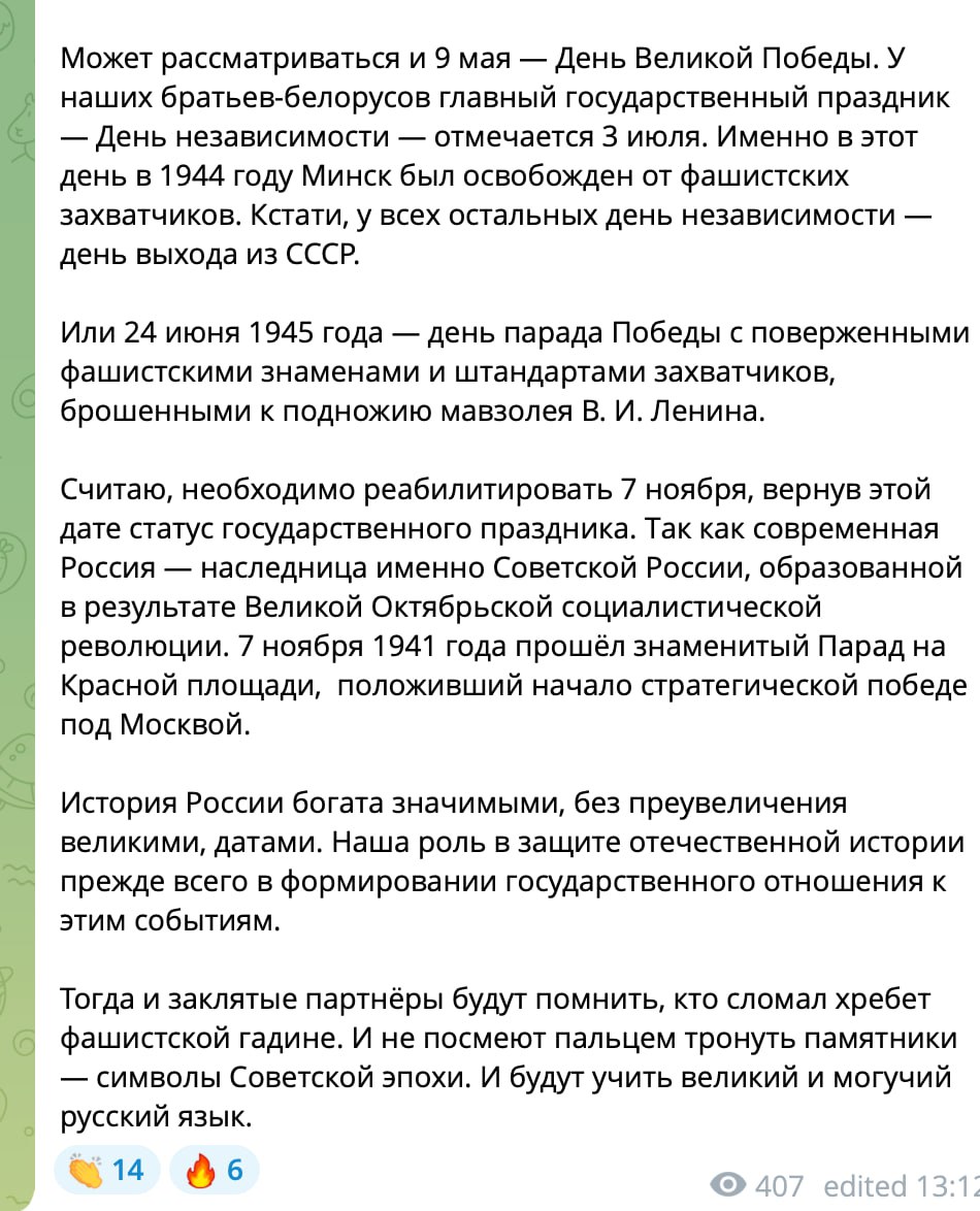 I believe it is necessary to rehabilitate November 7, returning this date to the status of a public holiday. Since modern Russia is the heir to Soviet Russia, formed as a result of the Great October Socialist Revolution