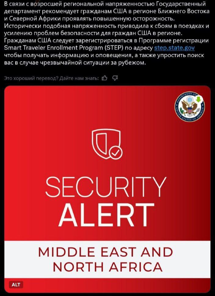 🇺🇸🇮🇷❗️As the threat of war between Israel and Iran grows, the US State Department has issued a major security alert for the Middle East and North Africa.