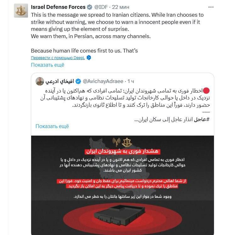 🇮🇷🇮🇱IDF calls for evacuation of Iranians living near weapons production facilities