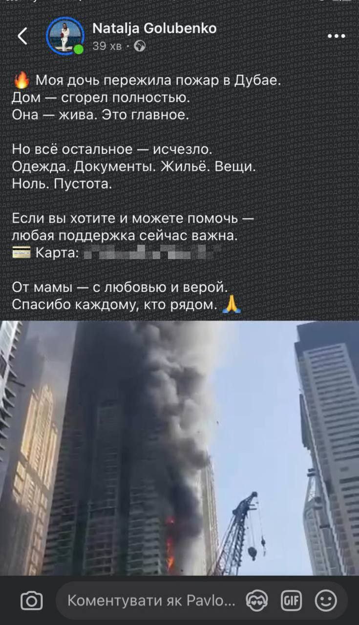 An ex-deputy of the Odessa City Council is asking for money after a fire in his apartment in Dubai. The day before, a skyscraper burned down there.