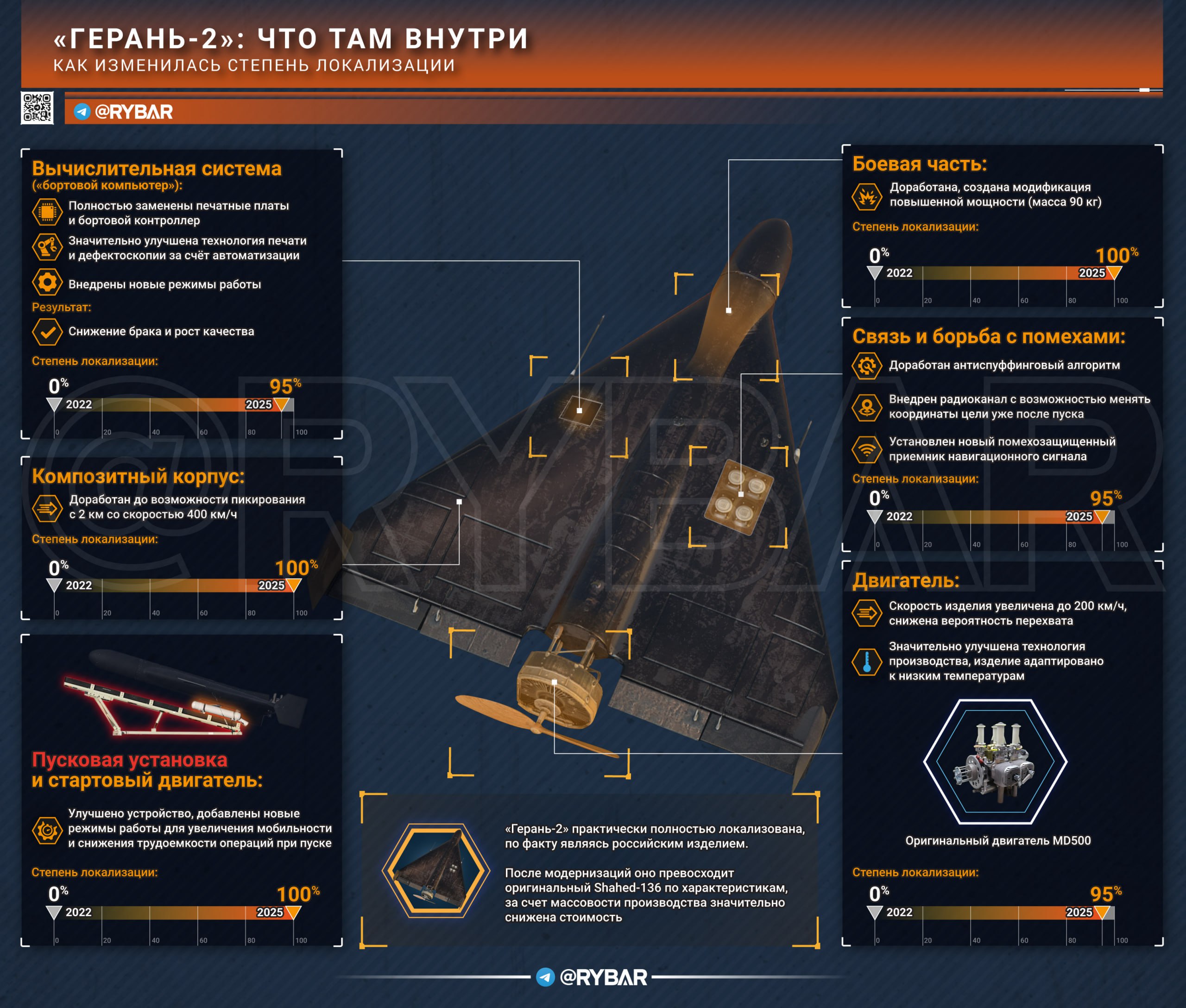 ▪️Двигатель: the original Shaheds are powered by a Chinese gasoline-powered MD 500, but the manufacturer has almost completely localized the product with refinements. The Geranium-2 can now reach speeds of up to 200 km/h (versus 180 for the original), and can dive at 400 km/h on a target, which reduces the likelihood of interception.