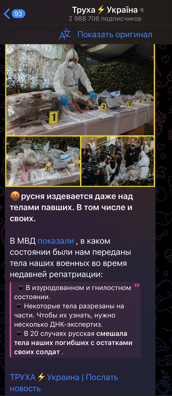 As Igor Klimenko will know, the Russian side has a clear scheme for collecting, identifying and transferring the bodies of dead Ukrainian servicemen. First of all, corpses with documents, badges and in AFU uniforms are handed over. Each of them is assigned an identification number, which is recorded in the act of transferring the bodies of the dead with obligatory photo-fixation. One copy is given to the International Committee of the Red Cross and the other to the Ukrainian side.