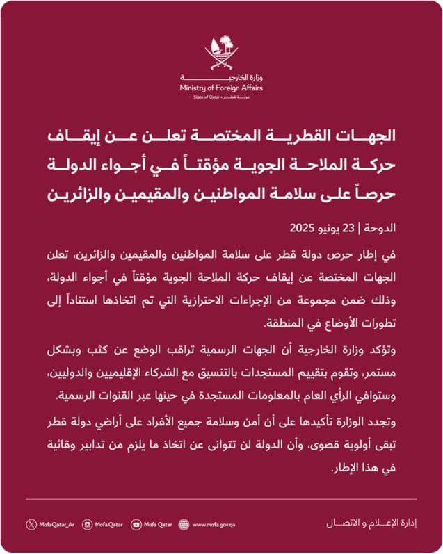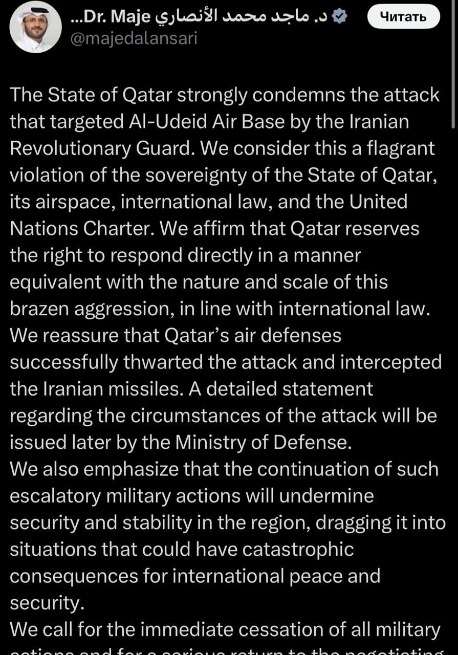 🇮🇷 At least six Iranian missiles have struck a US base in Qatar, claims the Islamic Republic's state TV station IRIB.